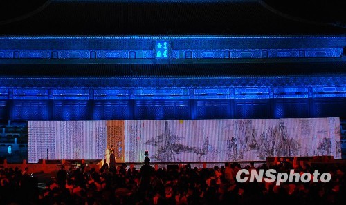 資料圖:2010年5月15日晚,珍藏在海峽兩岸博物館的《富春山居圖》在北京太廟通過屏幕實現“合璧”。中央文史研究館館長袁行霈為活動致辭,并與館員歐陽中石、程毅中、沈鵬、傅熹年、侯德昌、舒乙一起為高仿真的《富春山居圖》題跋。 中新社發 楊慧峰 攝
