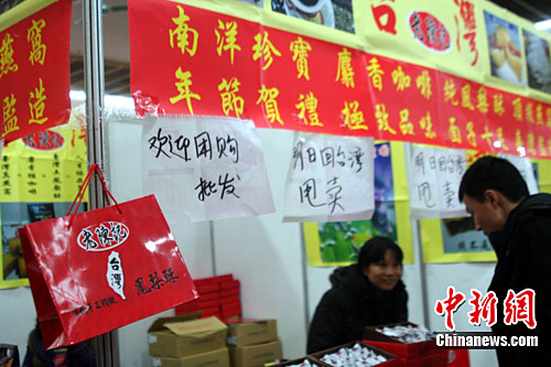 1月18日,在江西年貨節的臺灣食品展區內,鐘情傳統年貨的市民對這些從寶島帶來的特色食品感覺新鮮,但掏錢購買的顧客卻寥寥無幾。中新社發 劉占昆 攝