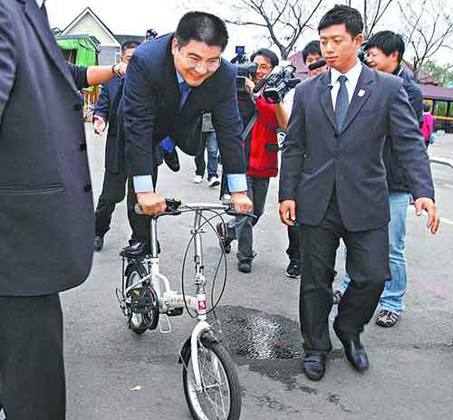 陳光標一行人昨到竹山紫南宮拜拜,還一時技癢跟民眾借腳踏車耍特技。圖片來自網絡