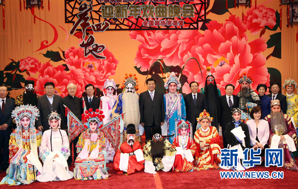 12月21日,“兩岸四地中國戲曲藝術傳承與發展·北京論壇”在北京全國政協禮堂舉辦戲曲晚會。中共中央政治局常委、全國政協主席賈慶林出席觀看。這是演出結束后,賈慶林同演職人員合影。新華社記者 劉衛兵 攝
