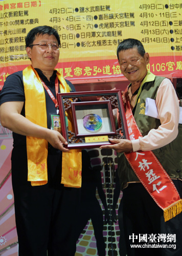 山西解州關帝廟文管所所長衛龍(左一)與臺南鹽水武廟負責人互贈禮物。(中國臺灣網 李典典 攝)
