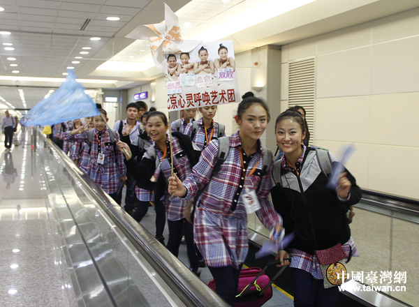 第六屆中華文化快車--北京心靈呼喚藝術(shù)團(tuán)交流團(tuán)一行,10月5日飛抵臺北,正式開啟兩岸中華文化交流臺灣之旅。圖為藝術(shù)團(tuán)團(tuán)員抵達(dá)桃園機(jī)場,難掩興奮之情。(中國臺灣網(wǎng) 普燕 攝)