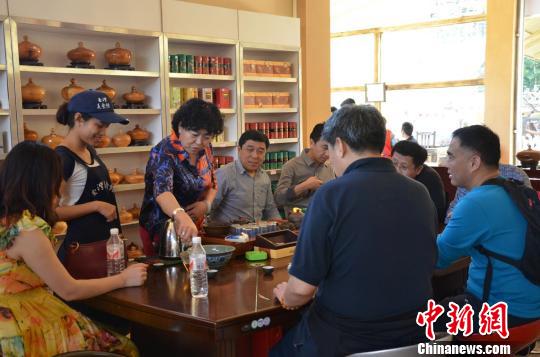 游客在臺(tái)灣美食工藝品館開(kāi)心地泡茶。(劉雨 攝)