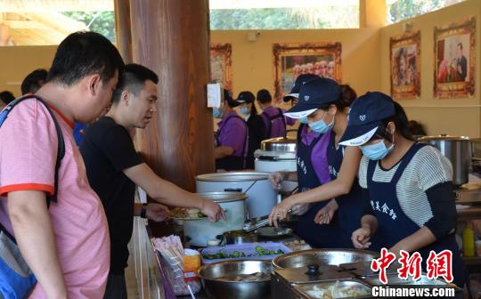游客在臺(tái)灣美食工藝品館品嘗臺(tái)灣小吃。(劉雨 攝)