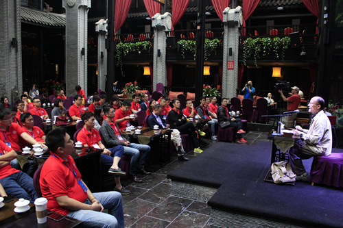 研習營一行首先參觀了武侯祠與錦里。在武侯祠,來自四川大學歷史文化學院的著名三國歷史文化專家方北辰為營員們上了一堂特殊的“商業課”。方教授以《諸葛亮出山之謎》為題,從商業運作、人才培養等角度重新解讀了“劉備三請諸葛亮”這一大家耳熟能詳的歷史故事,給營員們帶來了不一樣的三國文化體驗。方教授講完后,意猶未盡的營員們踴躍提問,與方教授熱情互動,現場掌聲、歡笑聲絡繹不絕。