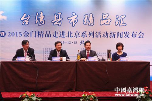 中國臺灣網12月15日北京訊。ㄓ浾 郜利敏)今日下午,“臺灣縣市精品匯暨2015·金門精品走進北京系列活動”新聞發布會在北京臺灣會館舉行。北京市臺聯黨組書記王蘭棟、副會長鄭大、金門縣長陳福海等出席發布會。