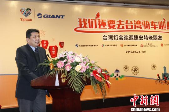 1月23日,臺灣海峽兩岸觀光旅游協(xié)會北京辦事處與臺資企業(yè)北京捷安特公司異業(yè)合作,舉辦“我們還要去臺灣騎車?yán)病_灣燈會歡迎捷安特老朋友”優(yōu)質(zhì)行程推介會。圖為臺旅會北京辦事處主任楊瑞宗致辭。 陳小愿 攝