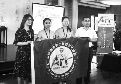 22日,由海峽兩岸婚姻家庭協會主辦的中華兩岸青少年世遺藝趣營在江蘇蘇州開營。約60名兩岸青少年將在為期一周的活動中,走近非物質文化遺產,體驗傳統手工技藝,感受蘇州園林之美。圖為開營儀式上舉行授旗活動。新華社發