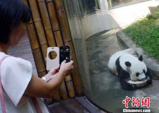 當(dāng)天,參加第十三屆榕臺(tái)青年夏令營(yíng)的40位臺(tái)灣青年學(xué)生來(lái)到海峽(福州)大熊貓研究交流中心,與生活在這里的35歲高齡明星熊貓“巴斯”等大熊貓“親密”接觸。
