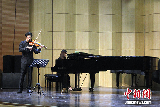 臺灣知名小提琴家鄭澤勛(左)為大陸聽眾演奏了柴可夫斯基的《旋律》等經典名曲。 中新社記者 陳小愿 攝