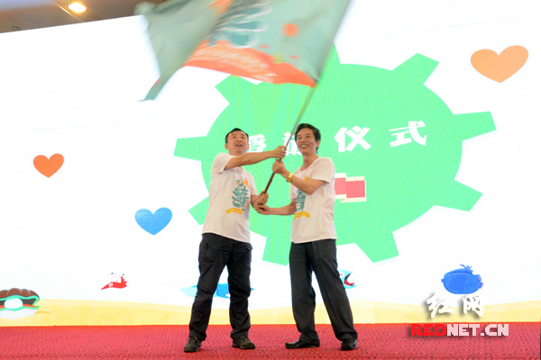 湖南省政府臺灣事務辦公室主任馮波(右)和湖南廣播電視臺副臺長胡衛箭(左)授旗。