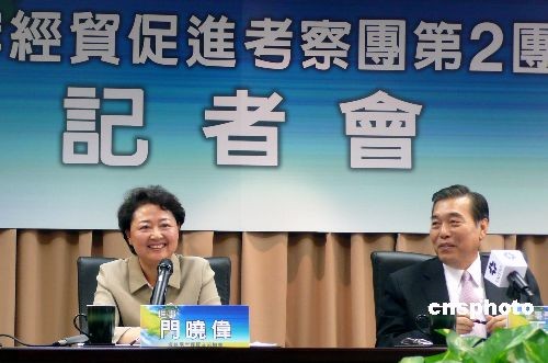 七月十七日下午,第二批“兩岸經貿促進考察團”團長、商務部商貿服務司副司長門曉偉(左)在離臺記者會中披露,在以流通食品、百貨及消費品為主的采購中,兩岸企業五天來現場成交金額達一億四千六百萬美元,未來一年內采購意向超出六億美元,圖為她和臺北世貿中心董事長王志剛在記者會中。 中新社發 劉舒凌 攝