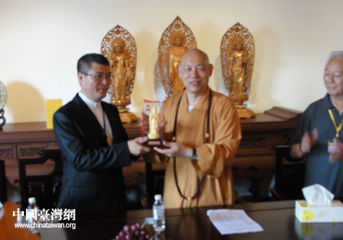 臺灣金蘭會會長臺南正統鹿耳門圣母廟主委王增榮與普陀山佛教協會會長道慈大和尚代表雙方互換禮物(圖片來源:舟山市臺辦)