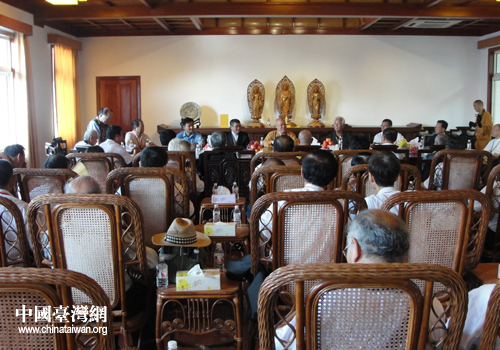 中國臺灣網7月8日舟山消息 日前,臺灣最大道教聯誼會寺廟金蘭會一行130余人在會長王增榮的帶領下來到浙江普陀山交流參訪。普陀山佛教協會會長道慈大和尚接待了參訪團一行,雙方舉行了兩岸宗教文化交流座談。