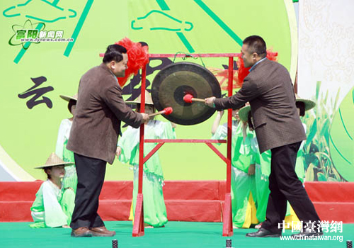 茶文化節(jié)上,來自臺(tái)灣南投縣農(nóng)會(huì)的客人與富陽市里山鎮(zhèn)有關(guān)負(fù)責(zé)人共同鳴鑼,宣布開幕。杭州市副市長(zhǎng)戚哮虎、市政協(xié)副主席何關(guān)新出席開幕式。