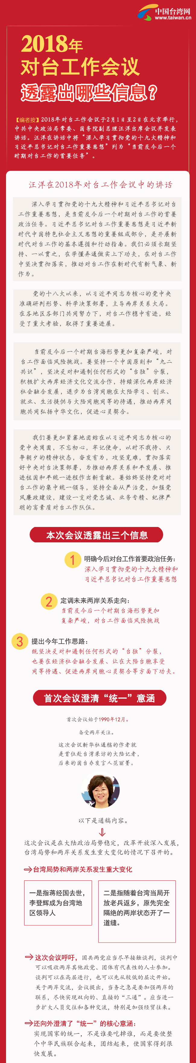 【編者按】2018年對臺工作會議于2月1日至2日在北京舉行,中共中央政治局常委、國務院副總理汪洋出席會議并發表講話。汪洋在講話中將“深入學習貫徹黨的十九大精神和習近平總書記對臺工作重要思想”列為“當前及今后一個時期對臺工作的首要任務”。