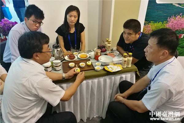農(nóng)交會(huì)期間,各臺(tái)創(chuàng)園的臺(tái)農(nóng)與農(nóng)業(yè)部相關(guān)部門(mén)負(fù)責(zé)人在臺(tái)灣展區(qū)溝通交流。(中國(guó)臺(tái)灣網(wǎng) 郜利敏 攝)