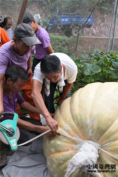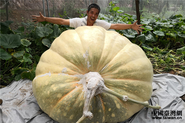 臺灣“南瓜達人”徐滄浩在梅州種出1040斤南瓜,或創中國最重南瓜紀錄。(圖片來源:梅江區臺辦)