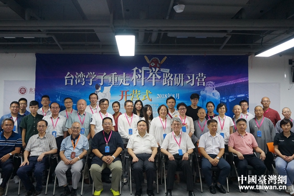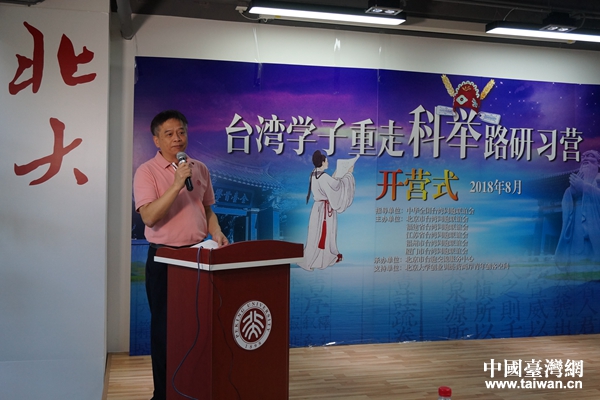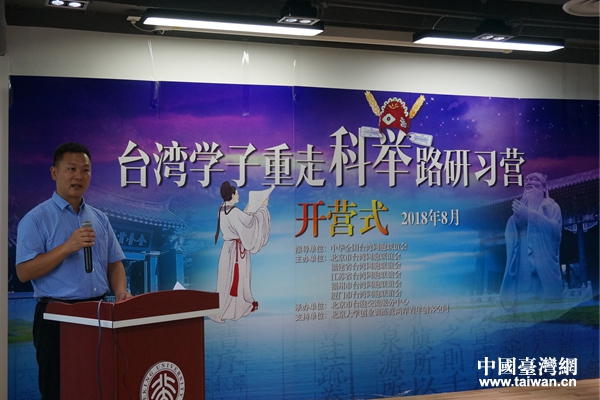 中國臺灣網8月21日廈門訊 8月20日下午,“臺灣學子重走科舉路研習營”在廈門北京大學創業訓練營兩岸青年創客空間隆重開營。中華全國臺灣同胞聯誼會研究室主任陳立謙、北京市臺灣同胞聯誼會副會長王慧、北京市臺灣同胞聯誼會名譽會長盧咸池、福建省臺灣同胞聯誼會副會長蘇甦、福州市臺灣同胞聯誼會副調研員許峰、臺灣華梵大學前校長高柏園、臺灣銘傳大學廣播電視學系主任杜圣聰等出席開營式。曾舉辦過“科舉制度在臺灣”高校巡展的臺灣華梵大學、銘傳大學師生和在京青年臺胞大學生組成的研習營及相關單位嘉賓50余人參加了開營式。