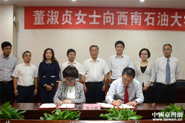 董淑貞與西南石油大學(xué)簽訂捐贈(zèng)協(xié)議。(圖片來(lái)源:四川省臺(tái)聯(lián))