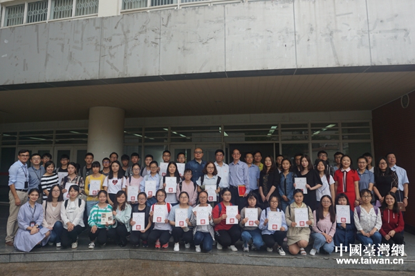 滕鴻年、張軍一行與受助四川大學(xué)學(xué)生合影留念。(圖片來(lái)源:四川省臺(tái)辦)