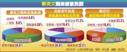 中國臺灣網1月29日訊 據臺灣《旺報》報道,臺灣民意基金會28日公布民調顯示,關于蔡英文在兩岸政策上的表現,有3成1滿意、6成不滿意,不滿蔡英文兩岸政策表現的創下了自其上任以來不滿意比例的最高紀錄;而關于蔡當局暫不批準大陸東方航空、廈門航空春節加班機申請的行為,有近4成4的人不支持、4成的人支持,反對的人略多一些。