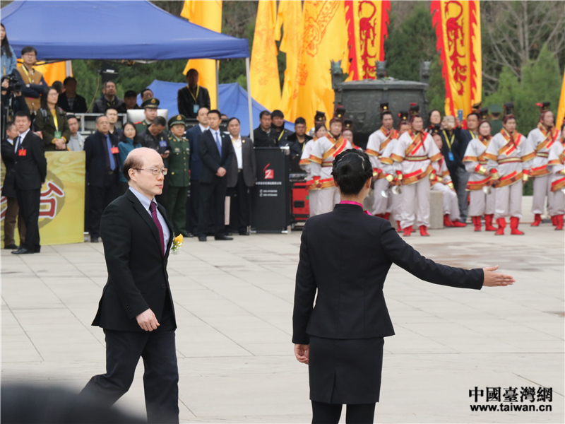 中共中央臺辦、國務院臺辦主任劉結一上臺向軒轅黃帝敬獻花籃。(中國臺灣網 李寧 攝)