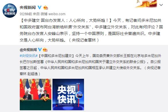 央視新聞消息:今天,有記者問多米尼加共和國政府宣布同臺灣斷絕所謂“外交關(guān)系”,中多建立外交關(guān)系,對此有何評論?國務(wù)院臺辦發(fā)言人安峰山表示,堅(jiān)持一個中國原則,是國際社會普遍共識。中多建交是人心所向,大勢所趨。