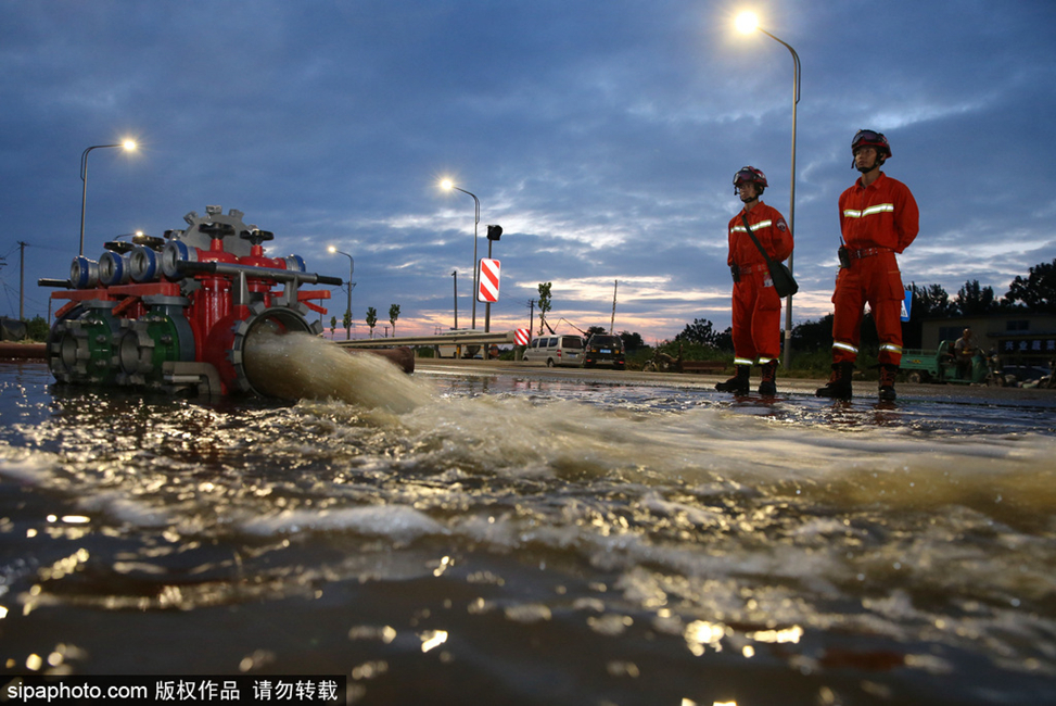 2018年8月27日晚,南通消防支隊戰士在山東省壽光市紀臺鎮趙家堯河村蔬菜大棚基地排水現場值守。