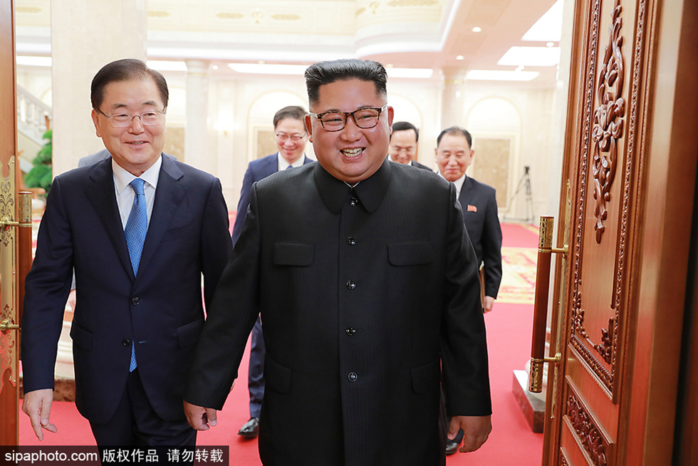 當地時間2018年9月5日,平壤朝鮮,當日朝鮮領導人金正恩于平壤會見韓國國家安全主任鄭英永。韓國代表團在周三訪問朝鮮期間與朝鮮領導人金正恩(Kim Jong Un)會晤,以安排定于本月舉行的朝韓峰會。
