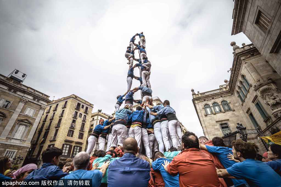 當地時間2018年9月24日,西班牙巴塞羅那,當地民眾疊羅漢秀神技,慶祝冬日節。