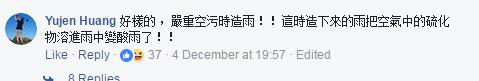 現在,重點來了,有臺灣網友質疑,若真的可以實現“人造雨”的話,那雨水里融進了空氣中如硫化物之類的有害物質,不就形成了“酸雨”,再降落到地面或農田的話,不僅會造成地表水的污染,民眾吃下或喝下的也都是有害物質啊,這不就相當于全臺灣的民眾都在慢性自殺嗎?