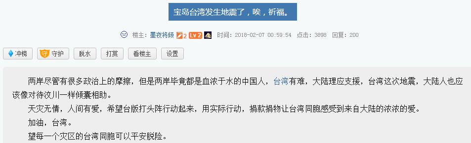 花蓮地震,也牽動著大陸同胞的心,不少大陸網友在網絡社群號召賑災,許多人表示要捐錢“跨海送暖”。截至8日22時,微博閱讀量已達1.8億,討論量43.7萬。大陸網友紛紛祈福,為臺灣加油,愿花蓮人民平安。