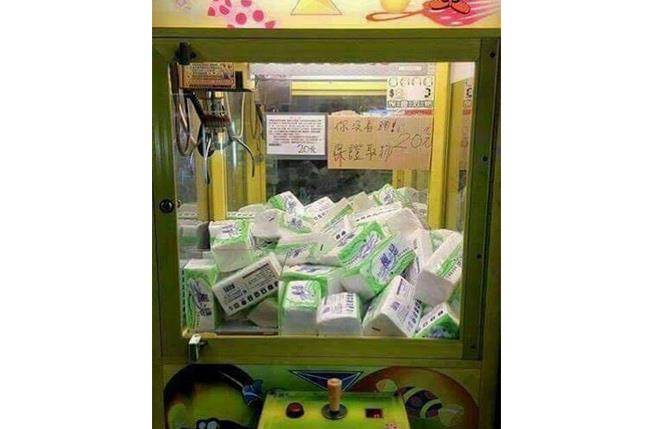 中國臺(tái)灣網(wǎng)2月26日訊 據(jù)臺(tái)灣《中國時(shí)報(bào)》報(bào)道,臺(tái)灣島內(nèi)衛(wèi)生紙價(jià)格可能調(diào)漲,搶購衛(wèi)生紙頓時(shí)成為“全民運(yùn)動(dòng)”。業(yè)者嗅到商機(jī),竟然連夾娃娃機(jī)也夾起“衛(wèi)生紙”,還標(biāo)榜“沒看錯(cuò),保證取物20元”!網(wǎng)友感嘆,大陸都是搶房、搶金子,我們搶衛(wèi)生紙和奶茶、臺(tái)灣就是個(gè)笑話689。