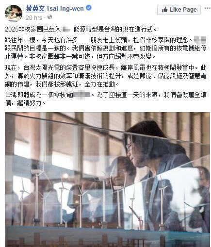 而眼見著反核游行民眾一波高過一波的質疑聲,11日當天蔡英文卻透過臉譜網重申了要建立“非核家園”的立場,更指出:臺灣即將成為一個零核電的地區,為了迎接這一天的來臨,臺當局會做萬全準備,繼續努力。