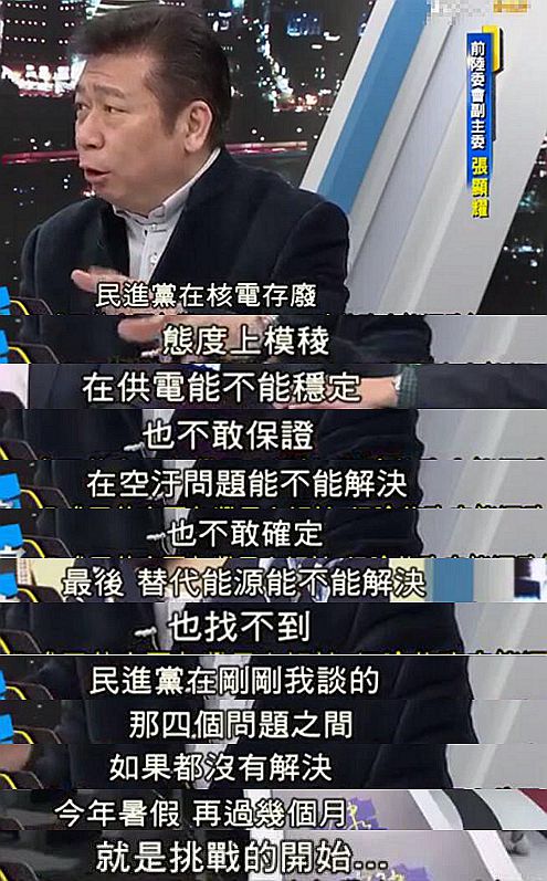 臺灣前陸委會副主委也指出,民進黨當局如今在核電存廢、供電穩定、空污治理、能源替代四大問題上皆無解決之法,民眾自然惱火,“你的政治承諾呢”?
