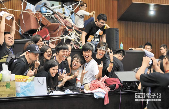 參與占領行動的學生在議場內興奮地合影。(圖片來源:臺灣《中時電子報》)