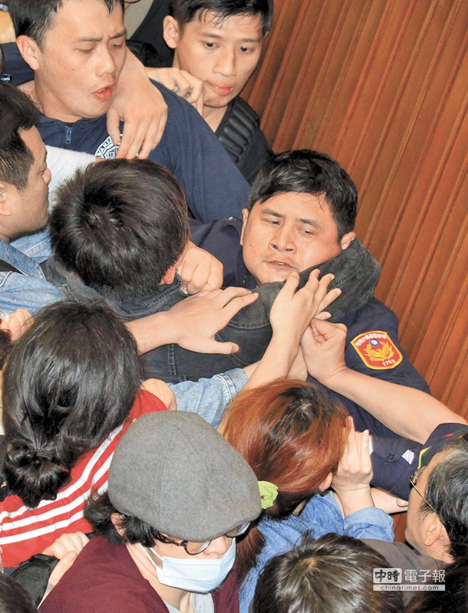 圖為當年身著制服的警察被民眾拉扯出議場。(圖片來源:臺灣《中時電子報》)