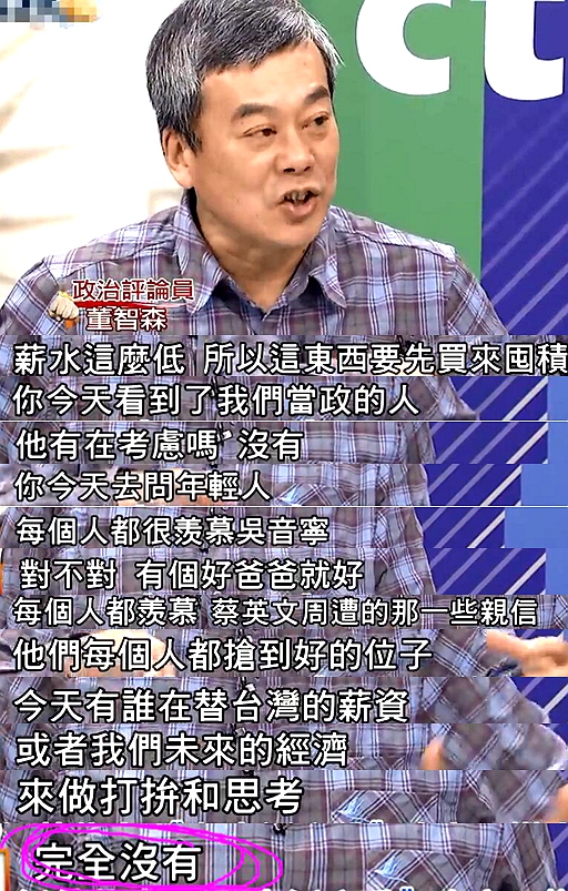 政治評論員董智森表示,薪水已經這么低了,但并沒有看到臺當局有人為經濟做打拼和思考,他還調侃,如今島內年輕人都很羨慕那個“有個好爸爸”的吳音寧及蔡英文周遭的親信,因為“每個人都能搶到(拿錢多還不用干事兒啊)好位置”。