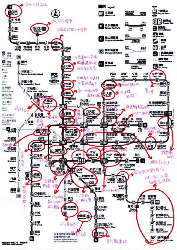 報道說,一名在臺北就讀大學3年的臺中網友,根據(jù)臺北捷運沿線整理各站著名景點。臺北車站是“迷宮,外地人出不去”、劍潭“士林夜市在這里,不要被騙了”、新北投“臺北人的澡堂”、淡水“臺北人的郊區(qū)”、龍山寺“可拜月老”、中正紀念堂“出錯出口得繞一大圈”、板橋“圣誕節(jié)超多人”等等。
