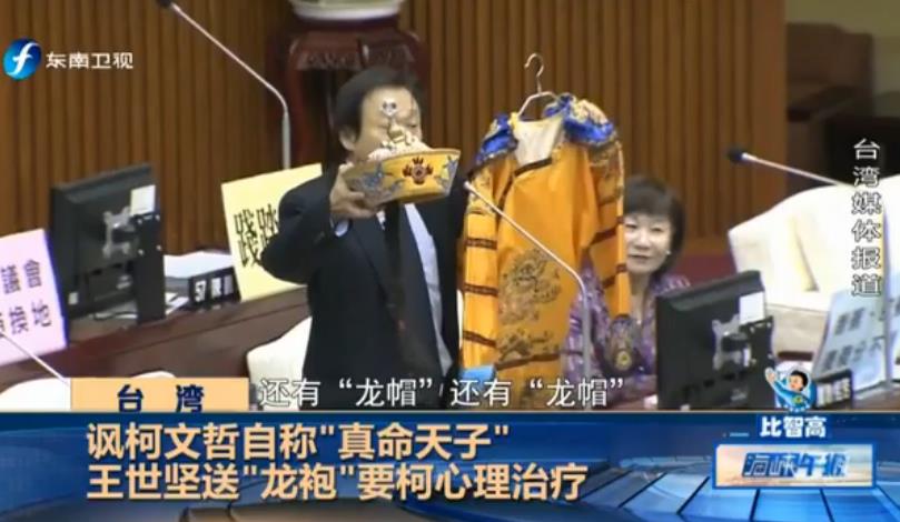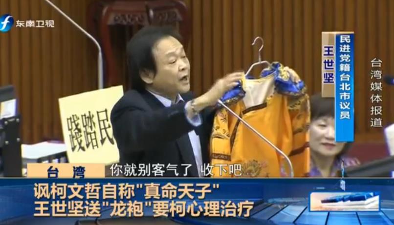 王世堅與柯文哲互懟早不止一兩次,情緒激動的王世堅也是不斷鬧出笑話。據東南衛視報道,柯文哲10日赴議會施政報告,王世堅拿出“龍袍”“龍帽”,說要送給自稱“真命天子”的柯文哲,引起全場哄堂大笑。王世堅說:“幫柯市長準備了一套‘龍袍’,讓柯市長私下在辦公室或在家里可以穿上它過過癮,這也算是一種心理治療”。他還勸說柯文哲,“送給自稱‘真命天子’的你,你就別客氣了,收下吧。”