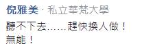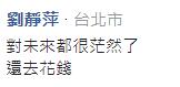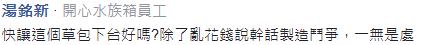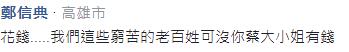 臺網友對此怒罵“今年花完,明年沒錢繳稅,你是要替我繳嗎?”“‘鬼島’悲哀!”“毫無儲蓄概念。”“她哪來的自信不會搞垮臺灣經濟啊。”“干話筒”“到底在講什么啊!”“臺北股市現在一萬多點叫人家趕快進來買股票?是讓外資比較好出貨嗎?萬一520當天臺股下殺破九千點,菜你要賠嗎?說你們綠色‘臺獨黨’是詐騙集團,真的不假。”“這黨說的話聽不得,我看可能又要搞老百姓了!”