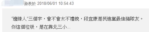 段宜康的這番“邊緣人”言論還沒等到呂秀蓮親自回應,網友們就看不下去了:“曾經與這種人同黨還真倒霉”“有本事不要待在不分區”“人家邊緣至少還能當副‘總統’,不像你自己其實邊緣到個極致,只能發個廢文”“你的曲棍球呢?”“支持段宜康=支持姚文智=支持民進黨”“做人總比做畜牲好”“要不要吞曲棍球。”