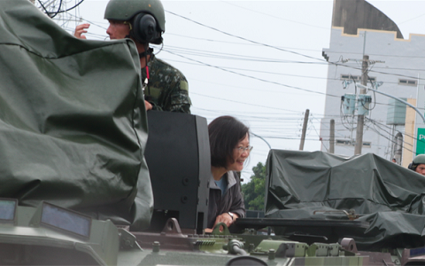 蔡英文搭云豹裝甲車進(jìn)入尚在淹水的布袋鎮(zhèn)永安里勘災(zāi)。(圖片來自臺媒)