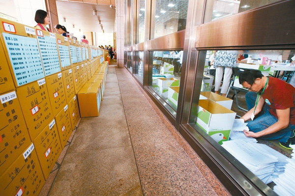 圖為臺“中選會”日前處理“公投案”送件。(圖片來源:臺灣《聯合報》)