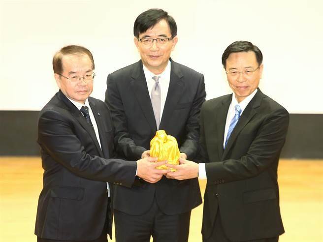 臺鐵局9日舉行局長交接典禮,卸任局長鹿潔身(左起)在臺當局“交通部長”吳宏謀的監交下,將局長印信交予新任局長張政源。(圖片來源:臺灣“中時電子報”)