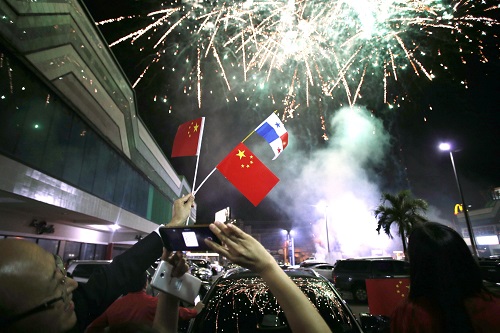 資料圖:6月12日,在巴拿馬首都巴拿馬城的華人社區,人們在巴拿馬與中國建交的慶祝活動上拍攝煙花。新華社發