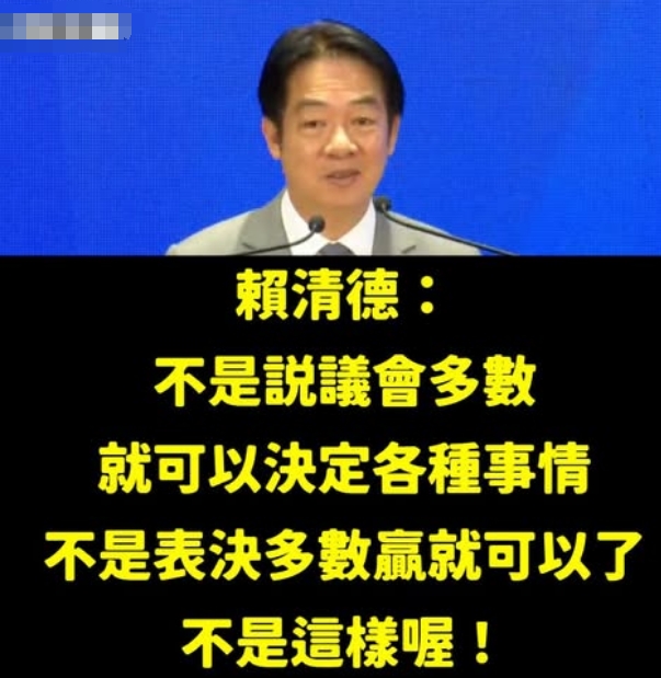 第三講中,賴清德更是重新定義了“民主”。他宣稱,“民主不是表決多數(shù)贏就可以”“不是議會(huì)多數(shù)就可以決定任何事情”,擺明在挑戰(zhàn)全臺(tái):雖然藍(lán)白占多數(shù),但表決通過不算數(shù)。有網(wǎng)友替賴清德翻譯:只有他說的才算,這才是“真民主”。