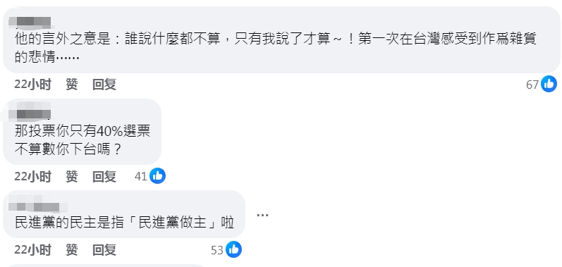 在賴清德還沒來得及對(duì)這位綠營(yíng)側(cè)翼的“急呼”作出反應(yīng)之前,不少藍(lán)白支持者搶先留言批評(píng),“不要多管閑事”,“就是想聽一人講十場(chǎng)的笑話”,還有網(wǎng)友嘲諷,賴清德“夢(mèng)幻十講”,一講長(zhǎng)毛象;二講“非我族類都是雜質(zhì)”;三講“民主不是多數(shù)說了算”,“才三講就這么精彩絕倫”,“越來越期待剩下七講了”。