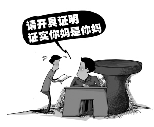 陳先生一家三口準(zhǔn)備出境旅游,需要明確一位親人為緊急聯(lián)絡(luò)人,于是他想到了自己的母親。可問題來了:他需要提供他母親是他母親的書面證明。據(jù)了解,這樣的奇葩“證明”不在少數(shù)。很多人在辦事過程中遇到過類似令人啼笑皆非的證明:要證明你爸是你爸,要證明你沒犯過罪,要證明你沒結(jié)過婚,要證明你沒有要過孩子,要證明你沒買過房……(4月8日《人民日報》)
